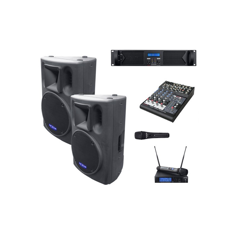 2 ks pasivních reprosoustav BC 1200, které jednoduše postavíte na zem pódia, na stojan, nebo zavěsíte, mixážní pult DMC 2220 pro smíchání všech signálů, koncový zesilovac DAH 800, ruční mikrofon MD 510 s kabelem a protivětrnou ochranou, ruční bezdrátový mikrofon MBD 840,, dva Jack / XLR 10m kabely k propojení mixážní pult – zesilovač a dva 10 m reproduktorové kabely Speacon / Speacon.