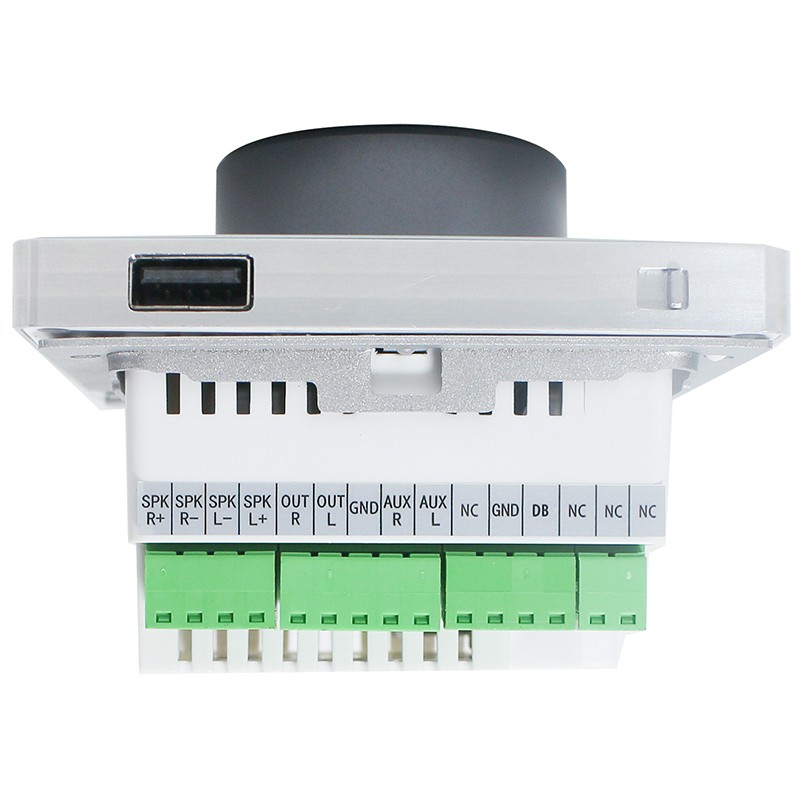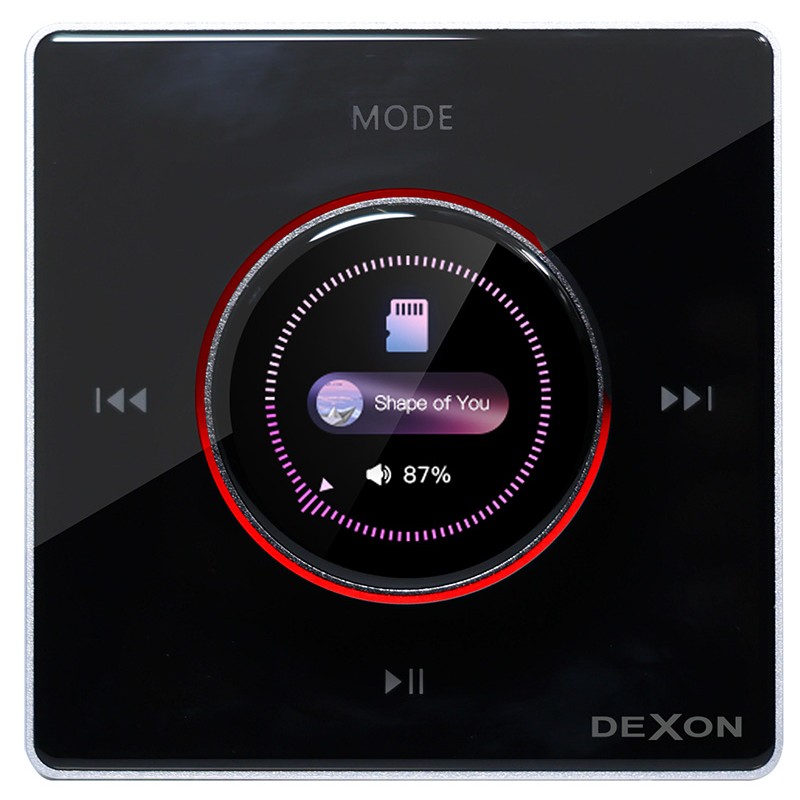 Jeho čelní panel totiž obsahuje rotační ovladač s displejem, který zobrazuje informace o nastavení hlasitosti, zvoleném zdroji hudby, názvu přehrávaného souboru a další. Rotační ovladač s displejem je navíc podsvícen LED kroužkem, který mění svou barvu v závislosti na otáčení. Nástěnný přehrávač dále ovládáme pomocí čtyř dotykových tlačítek, která jsou podsvícena při dotyku. A nechybí IR dálkové ovládání.
